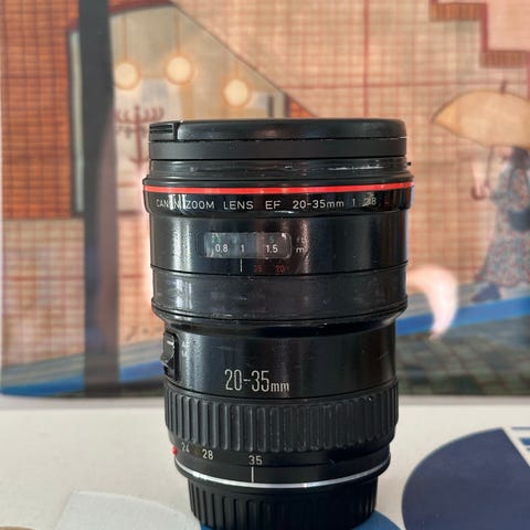 Canon EF 24-105mm zoomobjektiv med zoom- och fokusringar samt AF/MF-reglage på sidan. Har objektivlock och bajonettfattning för Canon EF-hus.