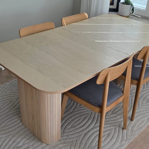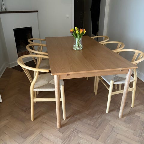 Stort matbord med bordsskiva i återvunnet trä med svart järnunderrede, 4-6 sittplatser. Underredet går att fälla ihop vilket gör bordet lätt att flytta och förvara. Bordet köptes på vintagebutiken Hippo & the Bird för 8000 kr.