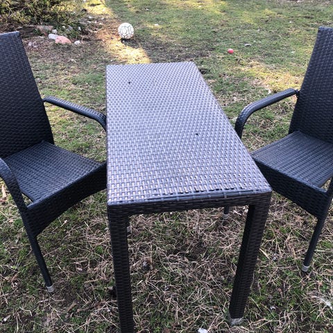 Runt glasbord med metallben och två svarta stolar i flätad stil. Smidigt set som passar bra på altan, balkong eller ute i trädgården.