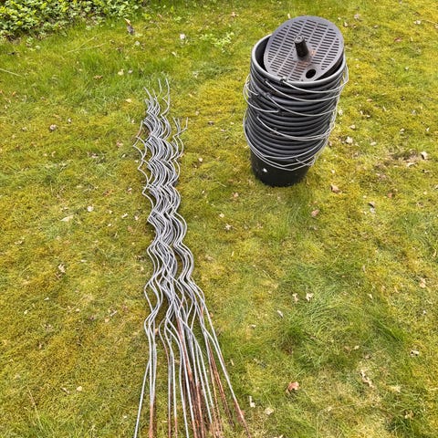 Rulle med begränsningskabel för robotgräsklippare och en hink med märlor, ca 200m? Räckte till 900kvm robotslinga. Finns i Halmstad