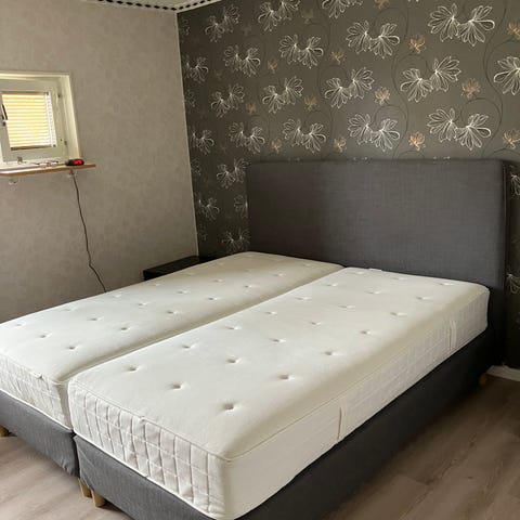 IKEA Sultan Saltnes kontinentalsäng 180x200 i vitt tyg med två bottnar och bäddmadrass. Står på träben och har avtagbart överdrag på bäddmadrassen.