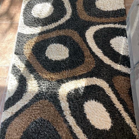 Matta från Svanefors i beige och gula toner med vågigt mönster. Ena sidan är långluggad och den andra är slätvävd så du kan använda den på båda sidor.