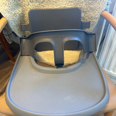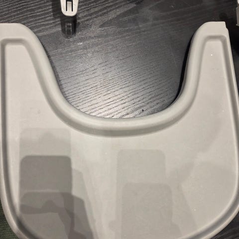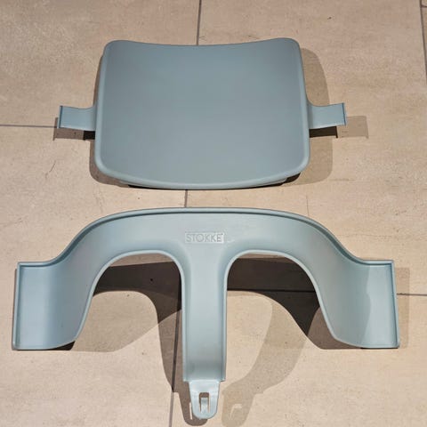 Matstolstillbehör: bricka och bygel till Stokkestol. Färg: blå. Inget att anmärka på.
