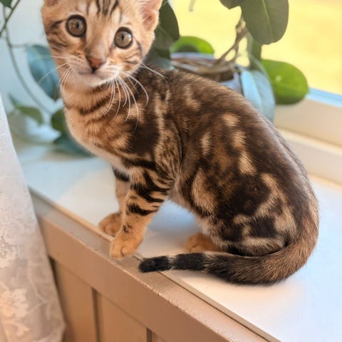 Rara Cookie som är en brunspottad bengalfröken och född 8/11-25 , snart 6 månader. Cookie söker sin egna familj. Vi har en liten uppfödning i Finspång med friska, hälsosamma, nyfikna, sociala och modiga bengaler.