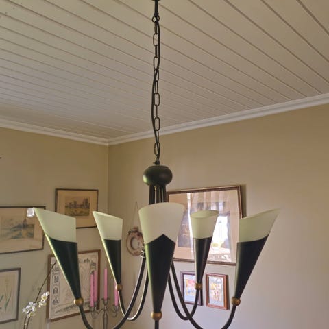 Snygg taklampa i smidesstil med kedja och flera ljushållare runt om. Passar bra över matbord eller i vardagsrum där man vill ha lite mer karaktär i belysningen.