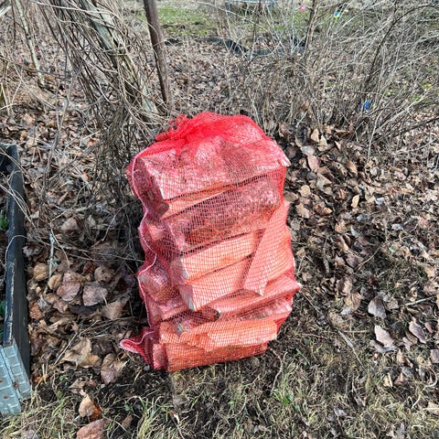Storsäckar fyllda med blandat ved, står uppställda utomhus. Bra för dig som vill ha mycket på en gång i stora säckar.