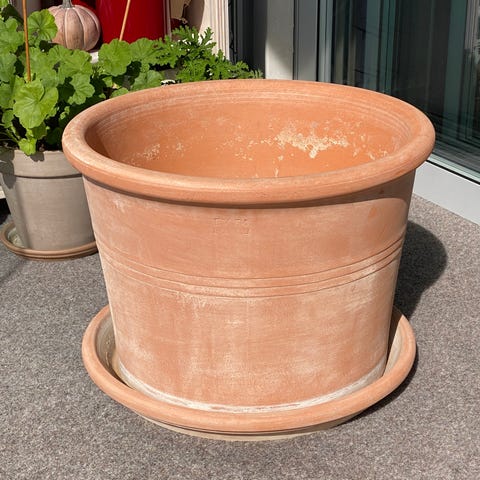 Vintage Urna/Vas Terrakotta/cremefärgad halva är glaserad