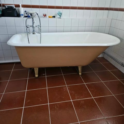 Vit duschkar i fyrkantig modell med runt duschområde. Har avlopp i hörnet med runt sil-lock.