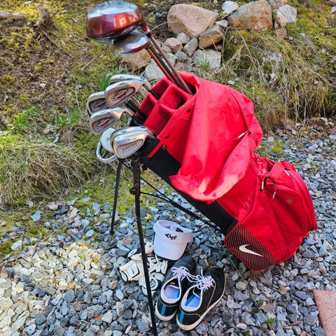 Golfset dam från Wilson med flera järnklubbor, driver/hybrid och putter. Med följer en TaylorMade golfbag med flera fack och bärremmar.