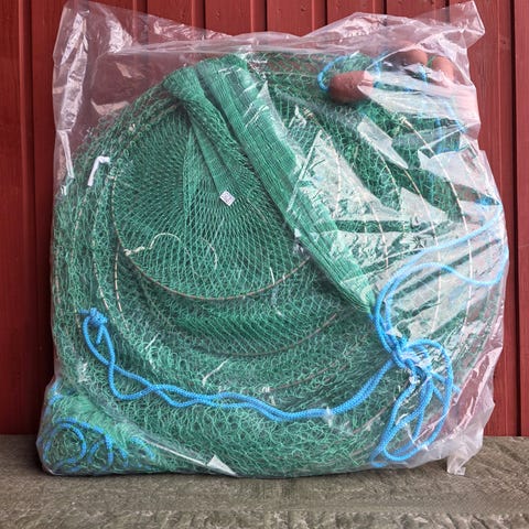 Stor hummerteine/kräftbur i orange nät med flera bågar och öppningar. Rejäl modell med gröna linor och metallstag, redo för nästa tur på sjön.