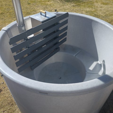 Före detta mjölktank.Innermått 1220mm och höjd 840mm.Avtappningskran och kylslinga.Men ej testad..Kanske lämplig som badtunna tex.