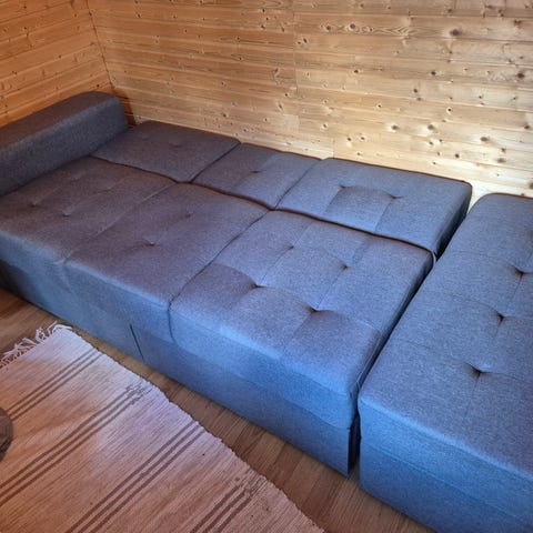En lila futon, något svagt märke, ej synligt direkt. Ben går att fälla ut på baksidan. Lite nedsutten i mitten. Går att fälla upp sidorna.