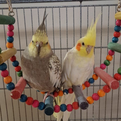 Vi sĂ€ljer tre fina nymfkakaduor â en hane och tvĂ„ honor. De Ă€r sociala, pigga och vana vid mĂ€nniskor.
