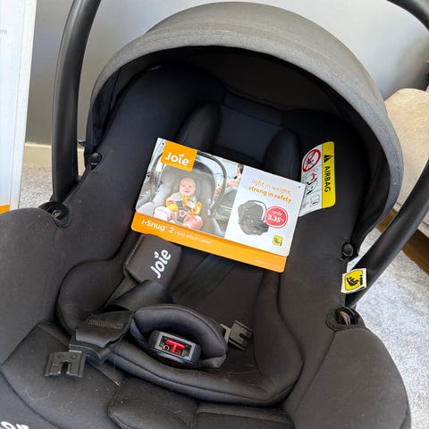 babyskydd för 0–13 kg i svart med justerbar sele och mjuk insats. Har bärhandtag och bas med fästen som syns på bilderna.
