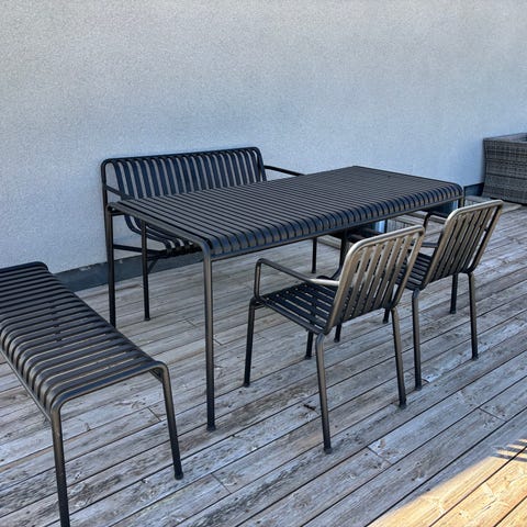 Otroligt snygga utemöbler retrostil! Oas av Hillerstorp med bord, bänk och två stolar i vit metall och trälameller. Stabilt set som står bra på gräsmattan och ger många sittplatser runt bordet. Cirka två säsonger gammalt. Nypris över 23000kr