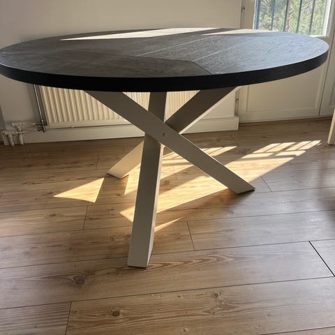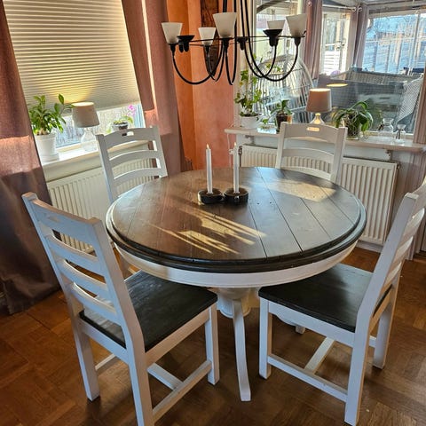 Superfint matbord 120 cm från Trendrum.se. Köpt i juli 2024 men har knappt använts då vi bott utomlands. 4 stolar i samma serie ingår och de är äldre men i fint skick.