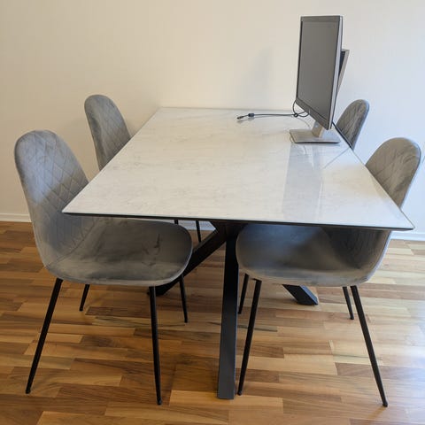 Matgrupp från Jysk, 6 st stolar Risskov med bord Agerskov. Bruksskick. Hem med 3 katter som klöst en del i stolarna. Se bilder för bedömning.
