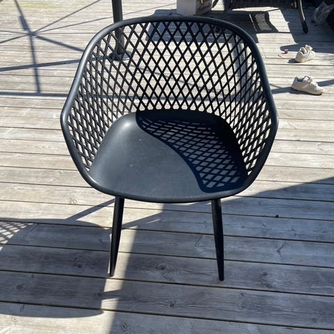 Grå fällbara utestolar med armstöd och tygsits/rygg i nätmaterial. Lätta att fälla ihop och ställa undan när de inte används.