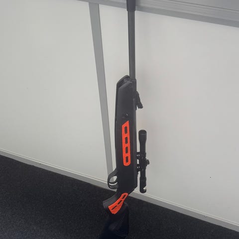 Suveränt luftgevär som används, och har använts, alldeles för lite. Underspännarm, inga kolsyrepatroner eller pumpar behövs.