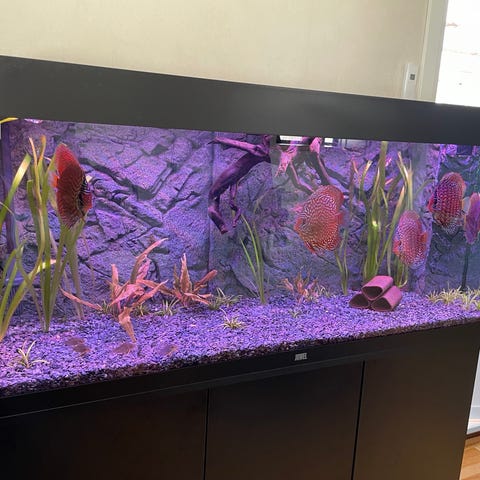 Akvarium med svart underskåp, sandbotten och flera gröna växter. Inredd med rötter, stenar och olika fiskar som syns på bilderna. Bl.a. Pictus, röd ancistrus, siamesisk algätare, upp och ner mal, skalarer, barber, tetror, mm.