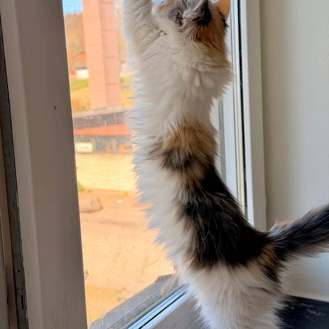 Norska skogskatter med lång, mjuk och tät päls som liknar päls/fur, samt en stor fluffig svans som påminner om en räv.