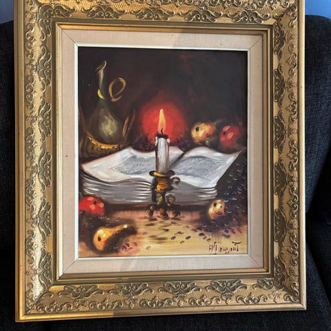 Fin oljemålning med kvällsmotiv vid en kanal och båt i hamn. Säljes med dekorativ guldfärgad ram som har mönstrad kant.