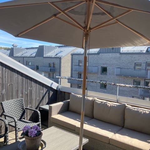 Stort komplett parasoll i grått inkl. fot och överdrag
