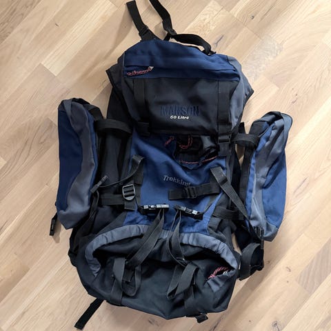 Rymlig vandringsryggsäck på 45 liter i blått och grått med flera remmar för att spänna åt packningen. Har vadderade axelremmar, höftbälte och flera fickor med dragkedja.