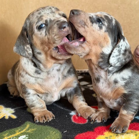 Bägge är kull syskon, hanar och stabila i psyket mot andra hundar.
