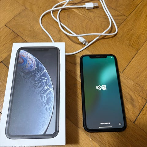 Vit iPhone XR med 64 GB lagring, enkel att använda och med tydlig skärm. Baksidan är i glas och knapparna sitter som vanligt på sidorna.