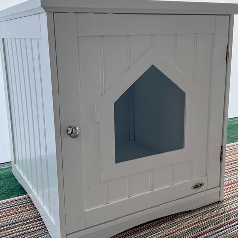 Fint litet trähus för hund eller katt med bågformad öppning framtill. Ovanpå finns en plan yta med räcke och en liten trappa upp på sidan.
