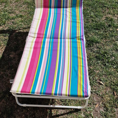 Två blåvit randiga fällstolar med vit metallram. Lätta att fälla ihop och flytta runt på altanen eller till stranden.