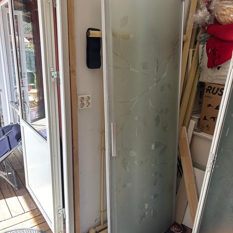 Säljer en duschhörna med glasväggar och en handdukstork.