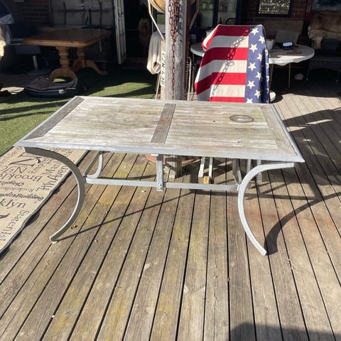 Rejält utebord från Hillerstorp i massivt trä med ribbad bordsskiva. Stadiga ben i trä och metallstag undertill för extra stabilitet. Bordsskivan är i behov av en slipning/lackering, därav priset.