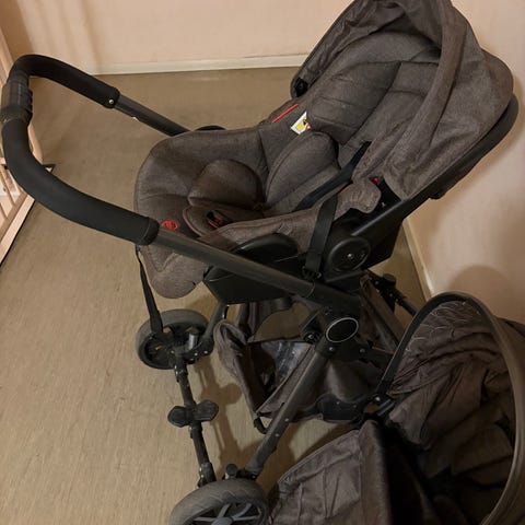Barnvagn med isofix stöd för bilen, olika stols-delar för växande barn och tillbehör finns.