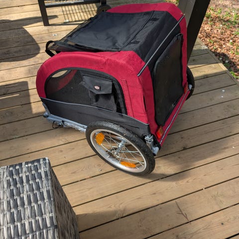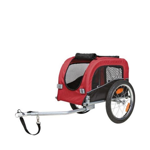 Röd och svart cykelvagn från Trixie med universal fäste till cykeln. Har öppning fram och bak, nätfönster och mjuk vadderad botten invändigt med fäste för halsband.
