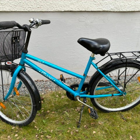 Blå Crescent barncykel med 26" hjul och lågt insteg. Utrustad med framkorg, pakethållare, stänkskärmar och stöd.