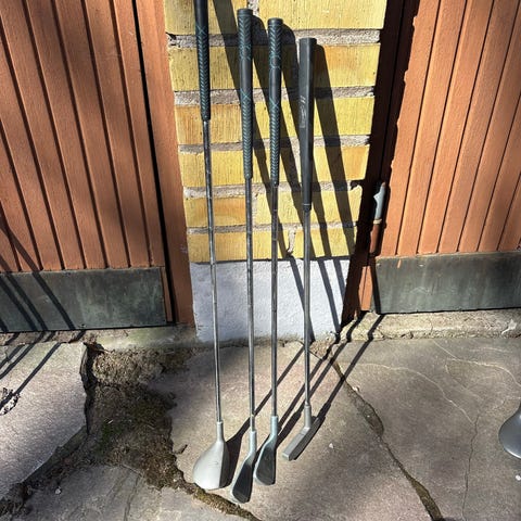 Golfset med klubbor från bland annat Acumark och Drimi i bärbag med stativ. Flera järn, woods och putter samt bag med axelrem och flera fickor.