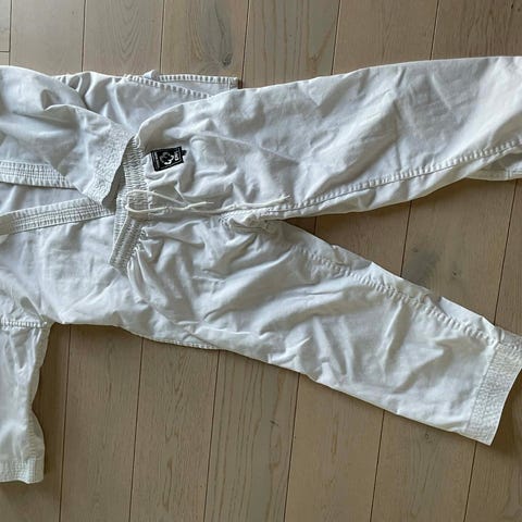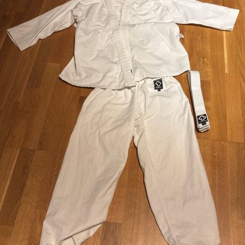 Vit taekwondodräkt från Budo-Nord i stl XXS med broderad logga fram och stort klubbmärke på ryggen. Byxorna har resår i midjan och dräkten har medföljande vitt bälte.