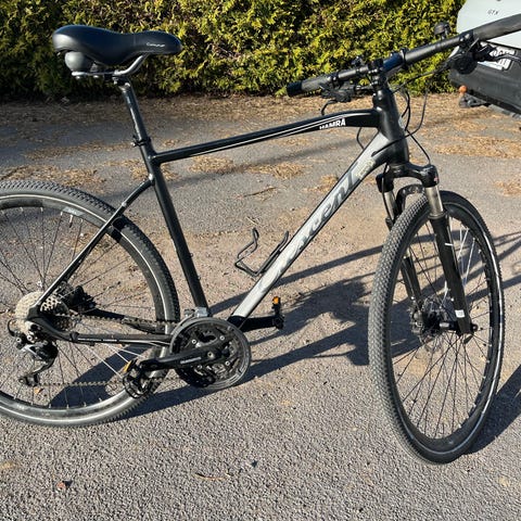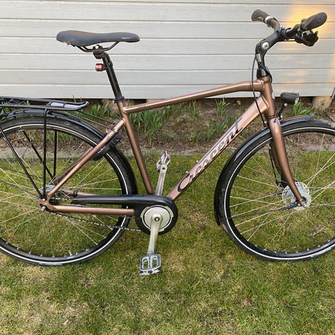 Säljer kvalitetscykel Crescent hybridcykel med ramstorlek 51cm och 28"-hjul, unisexmodell i vit färg. Utrustad med pakethållare, skärmar och handbromsar fram och bak. Skivbroms både bak och fram.