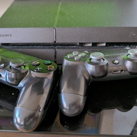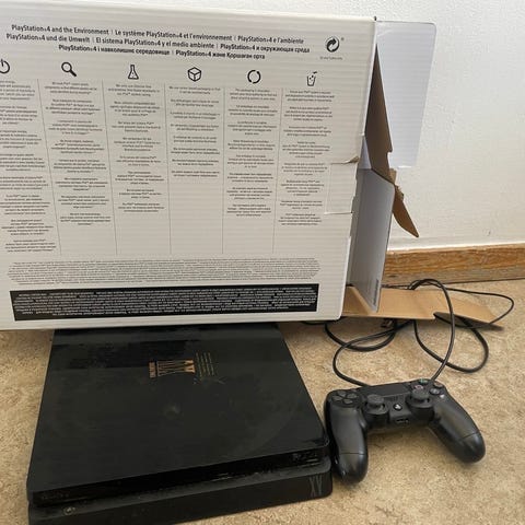Sony Playstation 4 med en svart och en blå handkontroll. Strömkabel följer med på bilden och konsolen är i standard svart färg.