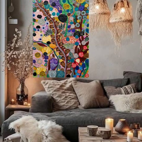 Målning utförd i akryl och olja på deep edge canvas. Motiv inspirerat av naturen och kallas Skymning i kolonin.