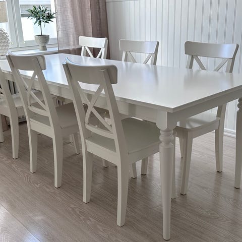 Bord 90x200cm nypris ca 6800:- sex positionsstolar nypris ca 3400:-/stol. 6 dynor medföljer.