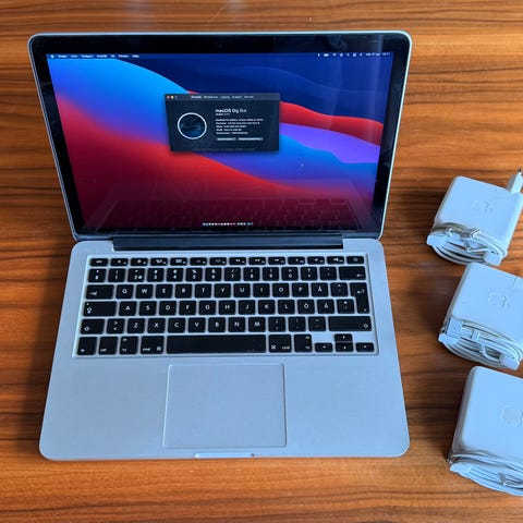 Viktigt att känna till: batteriet visar servicemeddelande i macOS och kapaciteten är kraftigt minskad, så batteribyte kan behövas framöver. Den fungerar dock både med laddare (medföljer ej) och utan.