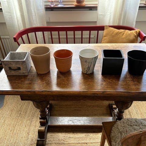 2 vita krukor och en i glas från Plantagen.