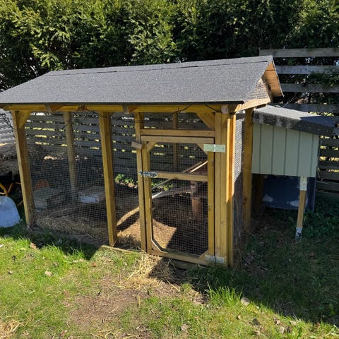 Kaninbur med utegård under. Flera dörrar som går att öppna för enkel skötsel.