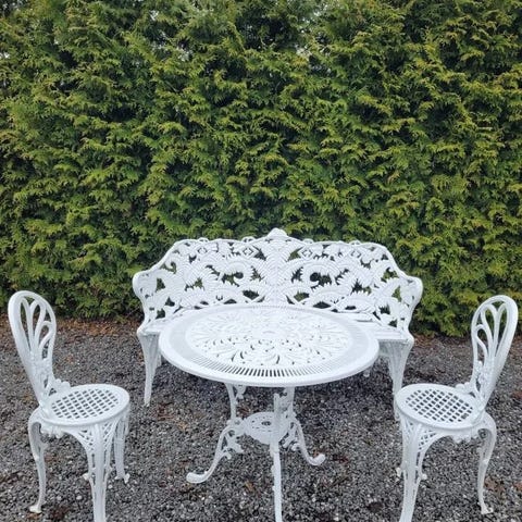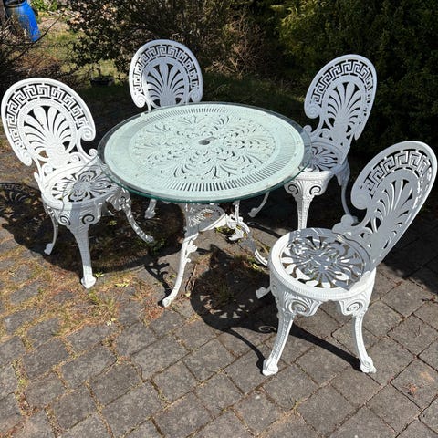 Vacker trädgårdsmöbel bestående av bord och 4 stolar i vitmålad gjuten aluminium. Vackert genombrutet mönster med bland annat meanderbård.