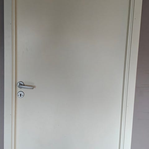Vit innerdörr med metallhandtag och nyckelhål. Enkel, slät modell som passar bra mellan rum inomhus.