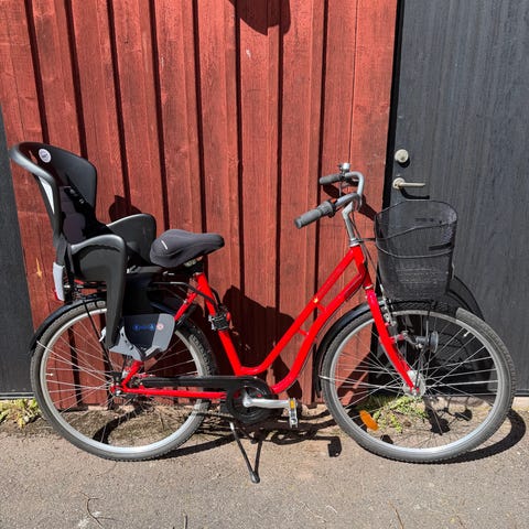 Säljer en snygg röd damcykel i klassisk retrostil. Perfekt för stadskörning och vardagspendling.