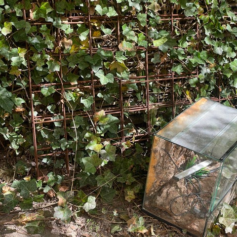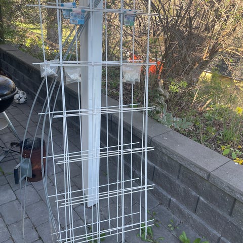 En spalje i metall, i obeliskform. Ca 180 cm hög och 28 cm i diameter